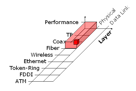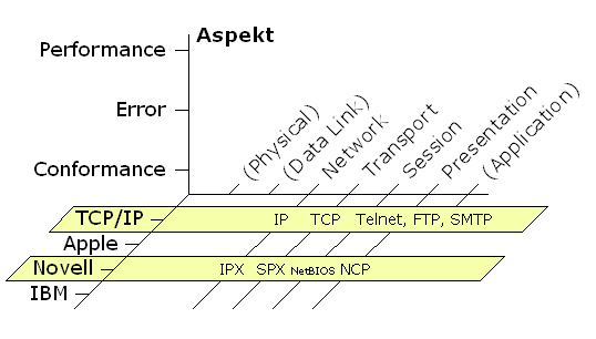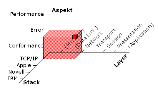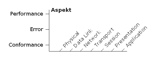 Die Anordnung der Punkte auf der Aspekt- und Layer-Achse ist so, das für die Funktion eines bestimmten Tests die jeweiligen näher dem Ursprung des Schaubilds liegenden Tests zuvor durchgeführt werden müssen. Natürlich wird dies ist der Praxis nicht gemacht, da bei einem Performance Einbruch im Applikations-Layer (z.B. langsamer Dateitransfer bei FTP) nicht die Konformität des physikalischen Trägers bezüglich seinen Spezifikationen nachgeprüft wird. Jedoch garantiert dieses sukzessive Verfahren das Finden des Fehlers.