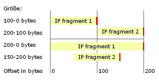 Der untere Teil des Schaubilds zeigt eine Fragmentierung, die den Teardrop Fehler ausnutzt. Das zweite Packet hat einen Offset, der kleiner ist als der des ersten Packets, und somit wird negativer Speicher allokiert, was den TCP/IP Stack zum Absturz brachte. Eine genaue Beschreibung des Fehlers für den Linux Stack findet sich bei [CPTIT].